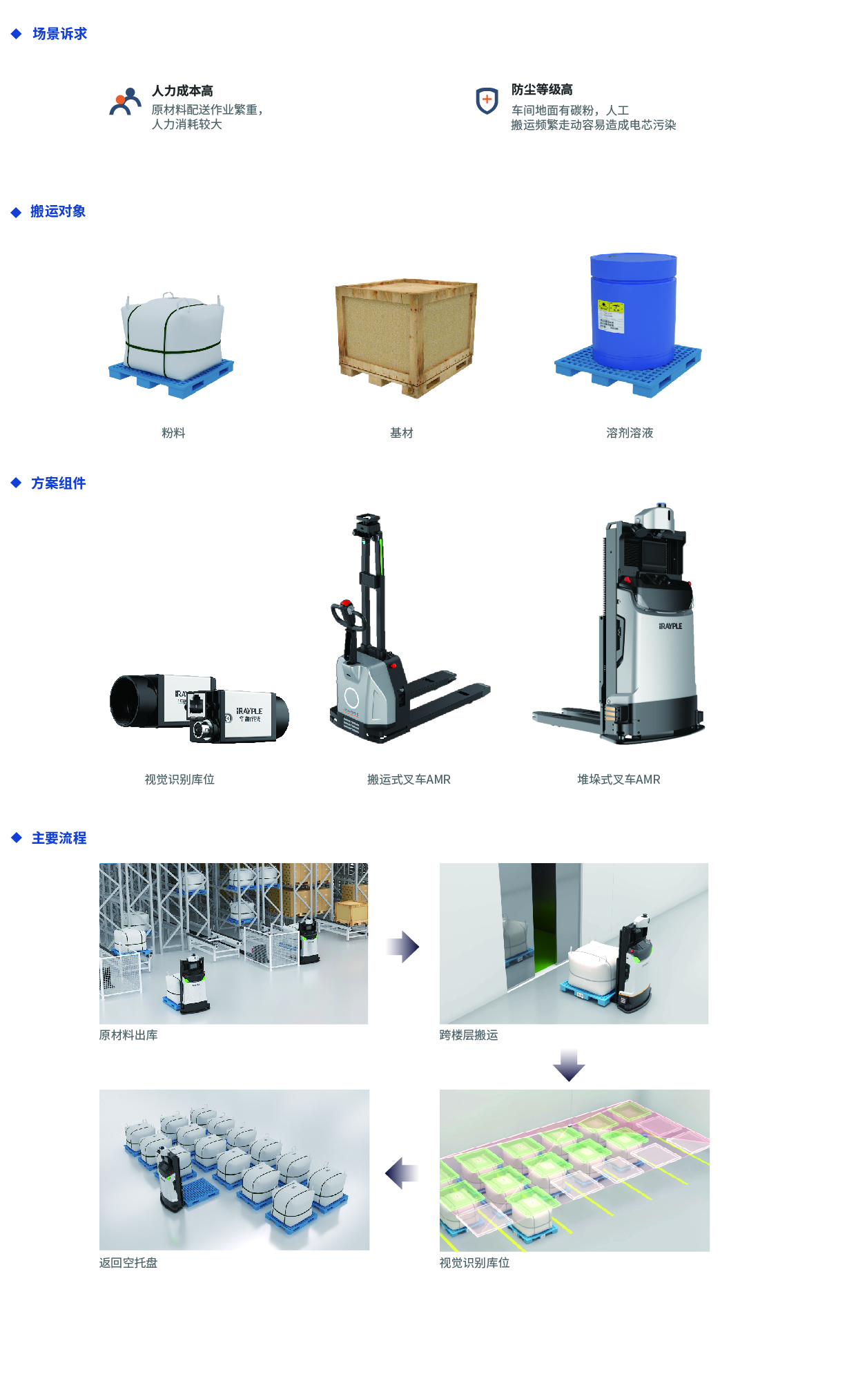 前工序生产过程中的原材料主要包含粉料、基材、溶剂等,人工重复搬运作业繁重;AMR的应用既可以对人工劳动进行有效代替,也可以减少搬运过程中的物料损坏,提高运输效率,更好的满足全线满产峰值需求。