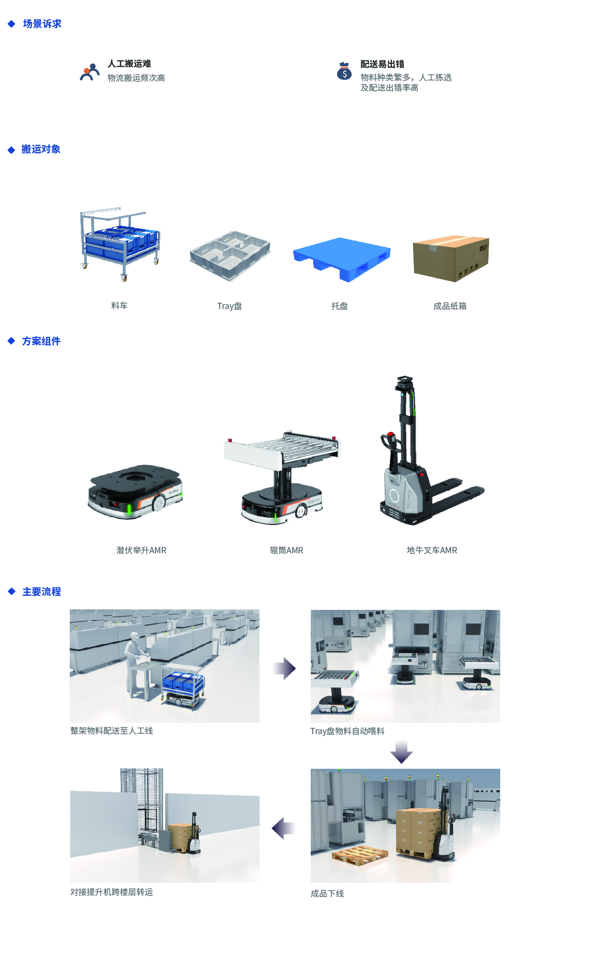 组装车间用于完成结构件、PCBA等物料的装配工作。结构件物料种类繁多,且大小不一,人员拣货易出错,搬运工作量大,送料及时性低。